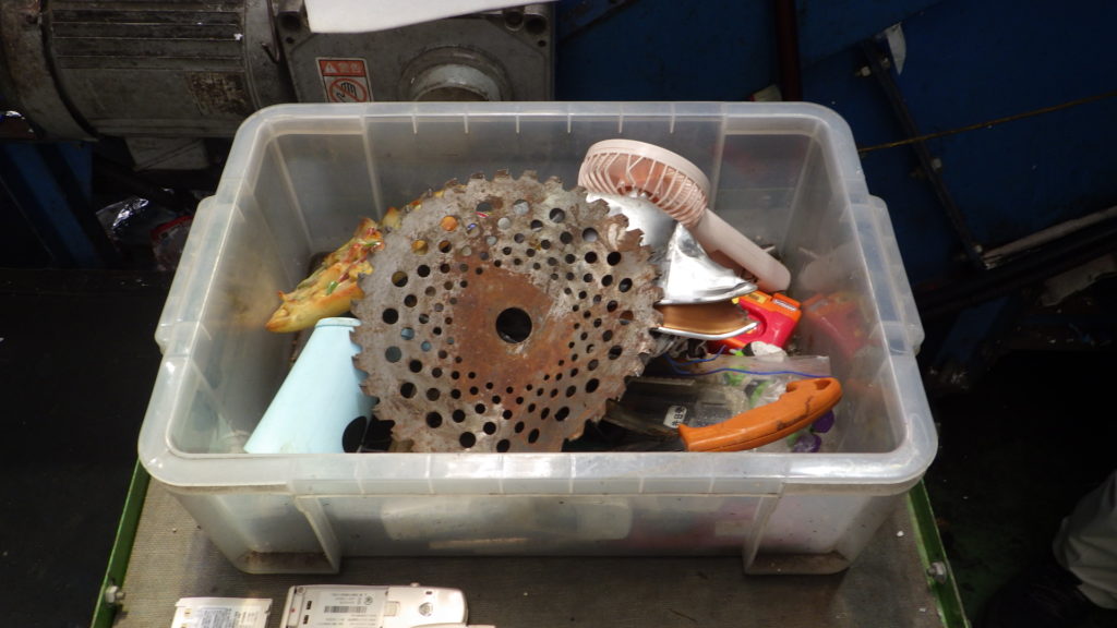 資源プラスティックの中に入っていた不適合物です。チップソー・ノコギリ・包丁・硬質プラ等、分別の支障になりますので絶対混入させないでください。